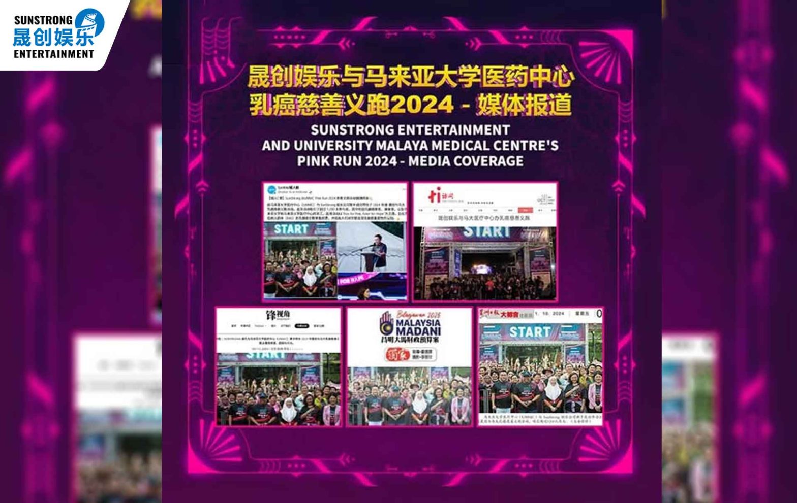 On October 5th, the SunStrong Entertainment and University Malaya Medical Centre (UMMC) Pink Run 2024 was successfully completed! The event attracted over 1,200 participants, including breast cancer patients, survivors, and staff from University Malaya (UM) and University Malaya Medical Centre (UMMC). Jment Lim, founder of SunStrong Entertainment, attended the event and gave a speech. He… Continue reading Thank you to our media friends for covering the “SunStrong Entertainment and University Malaya Medical Centre Pink Run 2024” event!